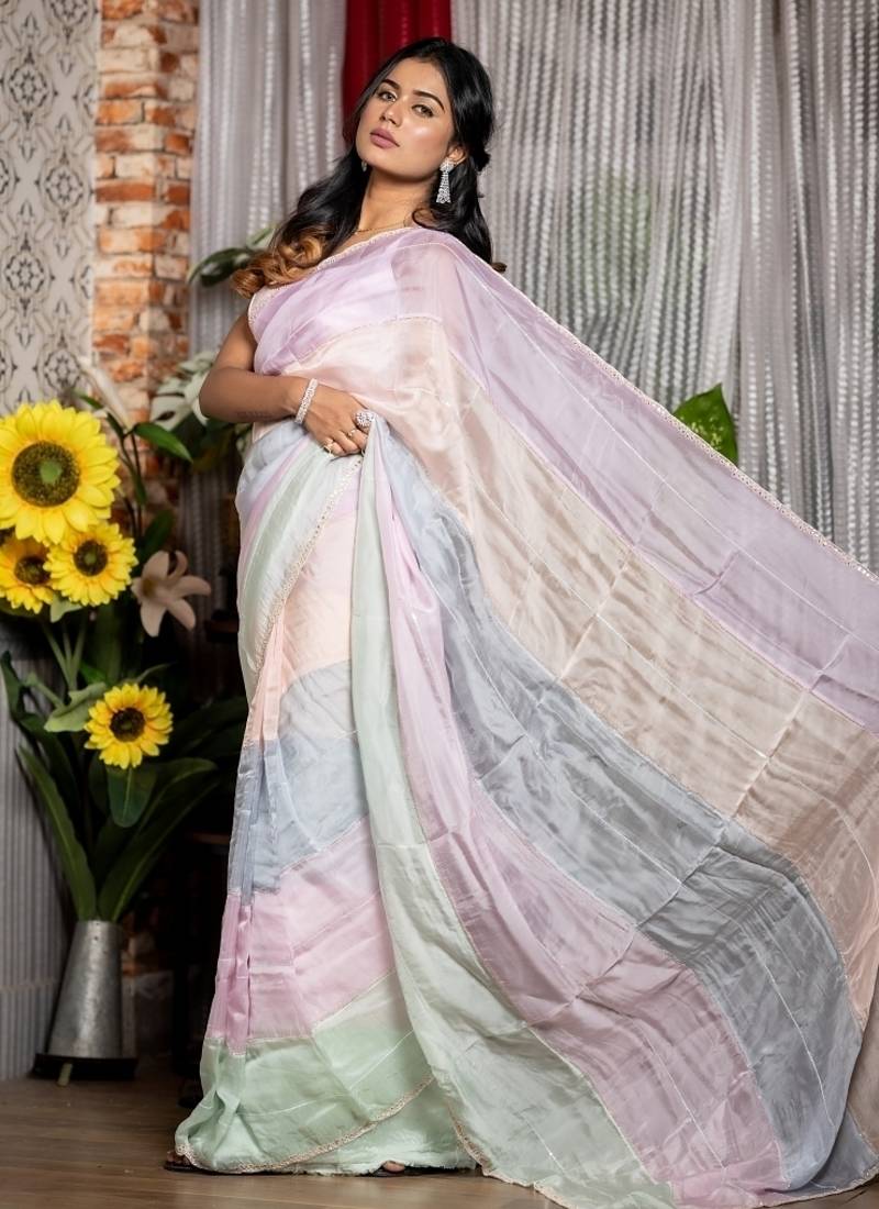 | Product Description | The Soft Organza Saree In Light &Dark Tone Mint Green, Lavender, Ice Blue, Peach &Pastel Pink Shades Shines Softly With All Over Sequins &Cut Dana Stripe & Gota Patti Handwork Border, Creating A Delicate Interplay Of Shimmer & Texture That Feels Both Elegant & Ethereal.