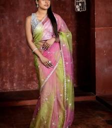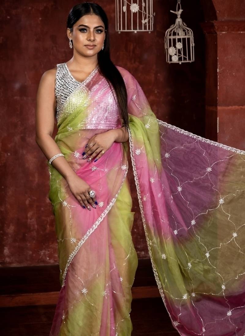 | Product Description | The Parrot Green &Onion Pink Shaded Rangkaat Tie &Dye Soft Organza Saree Features An All Over Arrangement Of Intricately Handworked Stone & Zardosi Floral Buta, Complemented By Silver Cut Dana Jaal & A Richly Crafted Floral Border With Delicate Silver Zari Piping — A Statement Of Elegance.