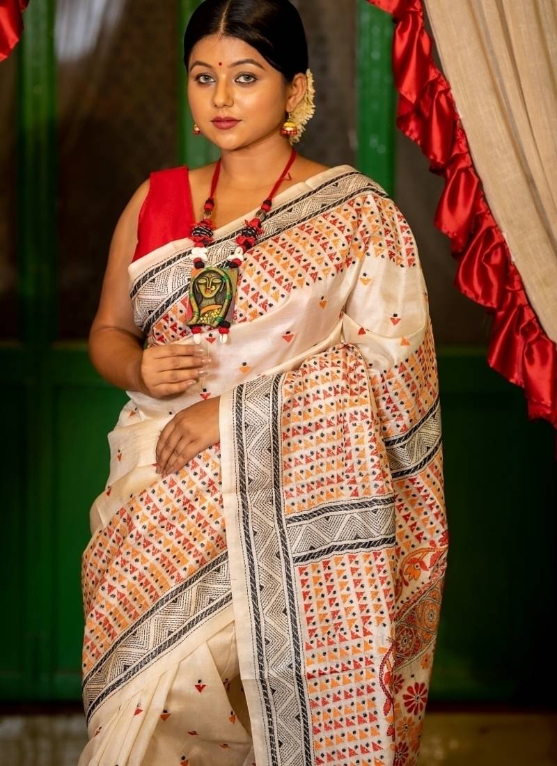 Off white hand woven tussar kantha work all seasons sarees