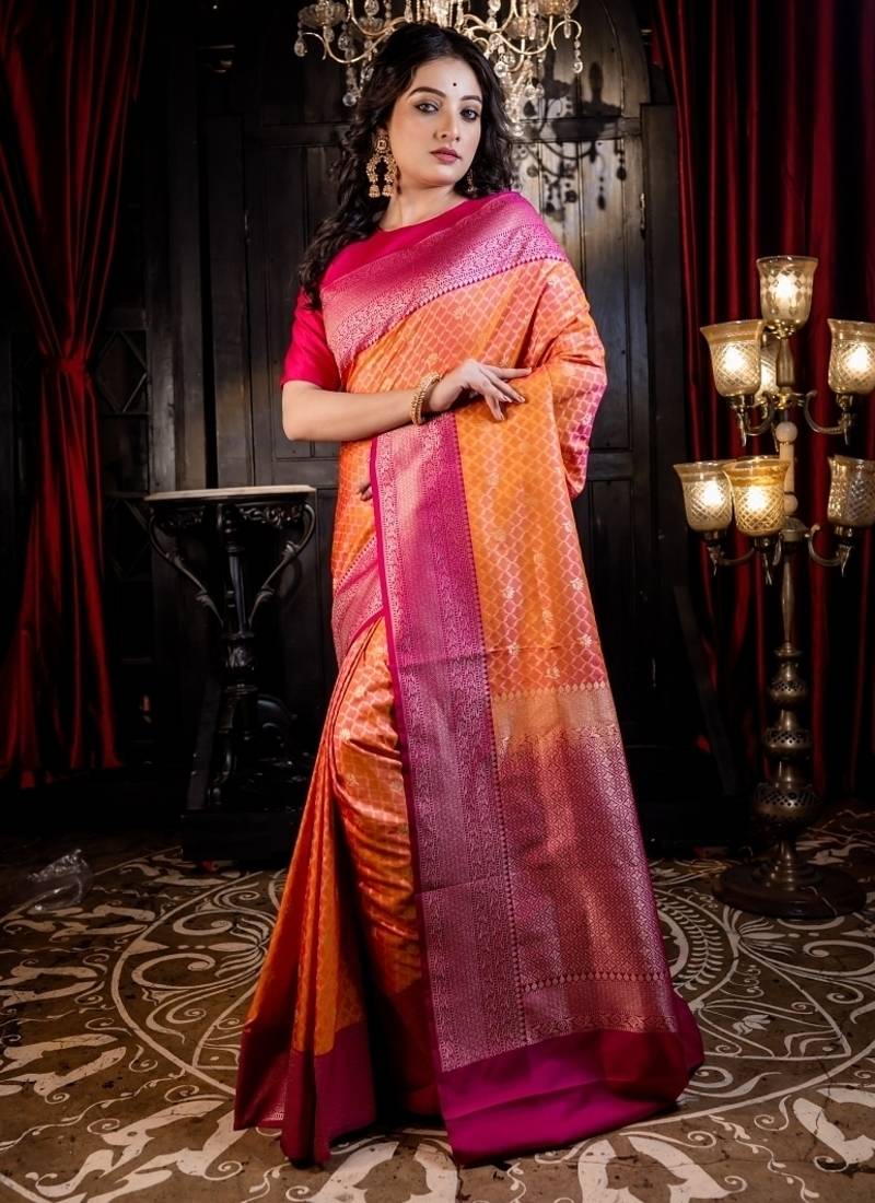 | Product Description | Vibrant & Elegant, The Orange Matka Silk Banarasi Saree Celebrates Festive Spirit & Traditional Artistry. The Bright Orange Matka Silk Base Is Adorned With All Over Jaal Woven In Gold Zari. The Striking Magenta Pink Border Adds A Vivid Contrast, Lively Energy & Sophistication.