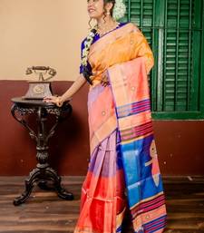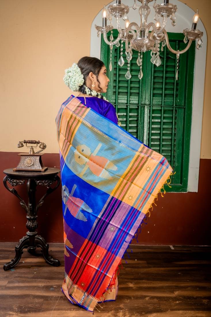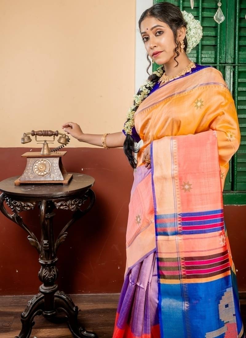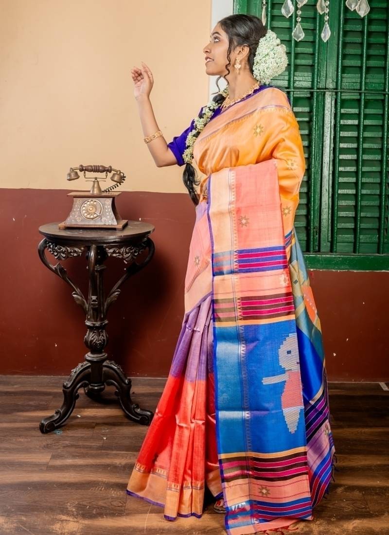 | Product Description | The Peach, Violet & Watermelon Pink 3 D Colour Block & Golden Yellow Dual Tone Pure Bishnupuri Katan Handloom Saree Is Adorned With All Over Multi Colour Buta, Crafted In Kalakshetra Embroidery & Features A Distinctive Striped Pallu With An Eye Catching ‘Tribal Doll’ Motif—A Charming Nod To Folk Heritage.