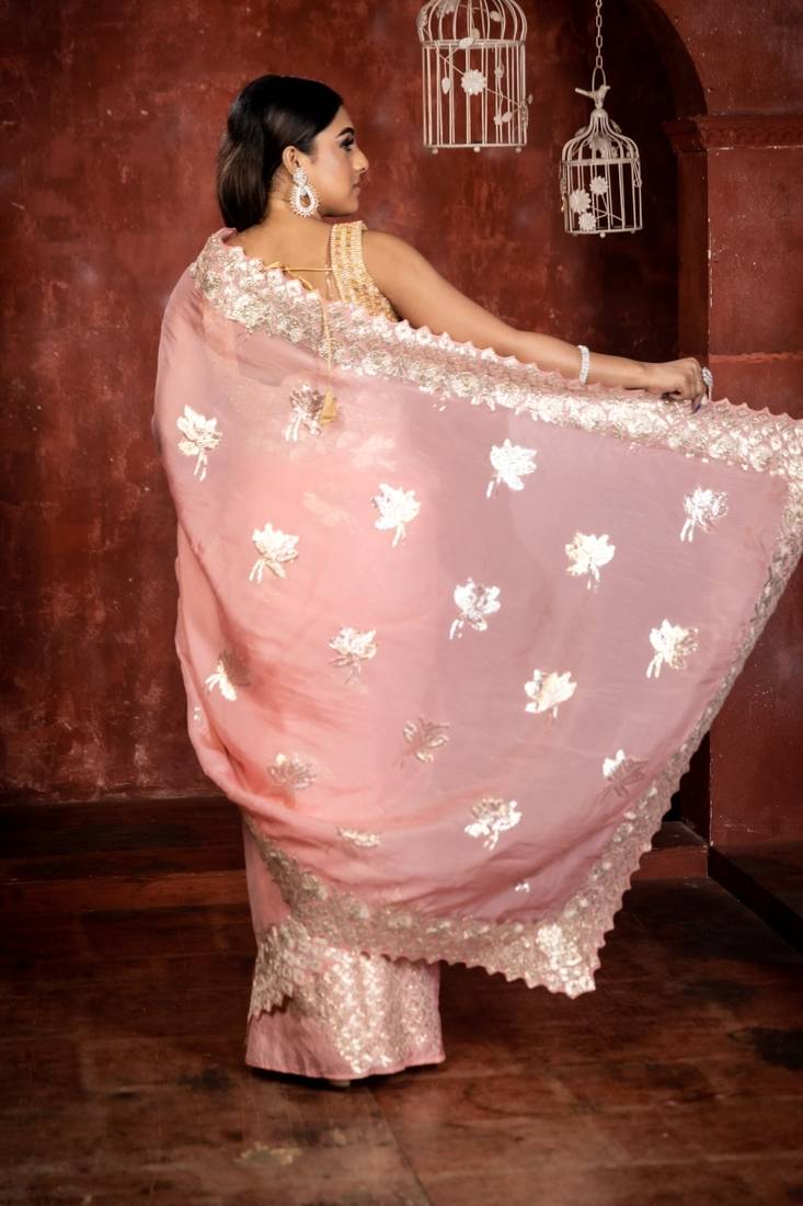 | Product Description | The Rose Pink Soft Organza Saree Showcases All Over Silver &Antique Gold Zari Floral Motif & Gota Patti Handwork Border, Bringing Together Heritage Weaving With Festive Opulence. Whether You're Attending A Pre Wedding Gathering Or An Elegant Dinner, This Piece Ensures Timeless Sophistication With A Touch Of Shimmer.