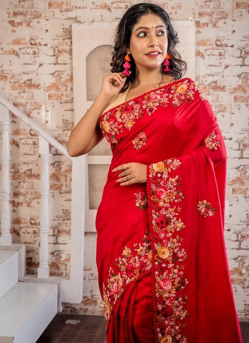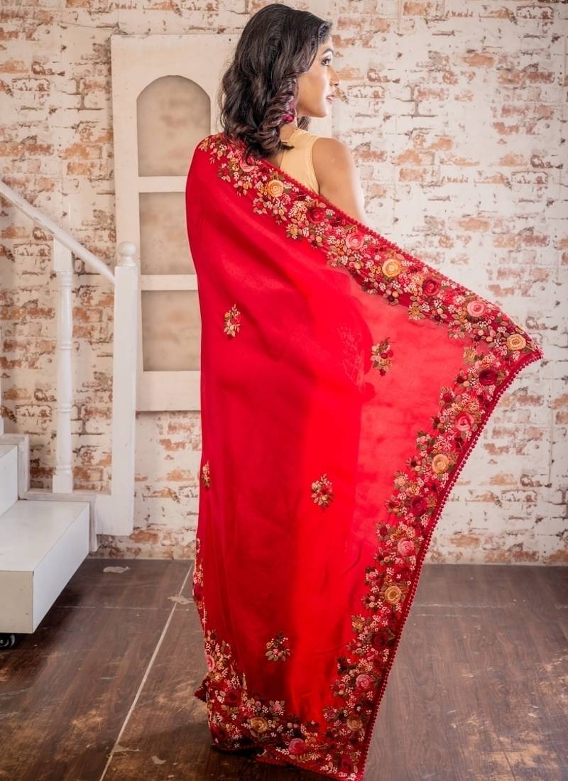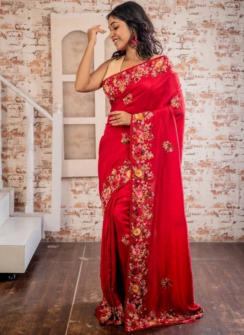 Red embroidered faux silk blend blend hand embroidery all seasons sarees