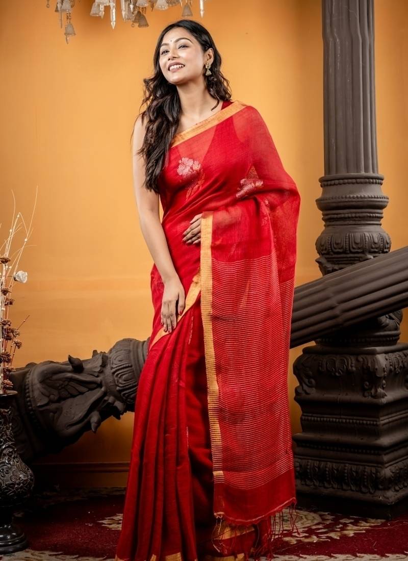Red woven linen zari work all seasons sarees