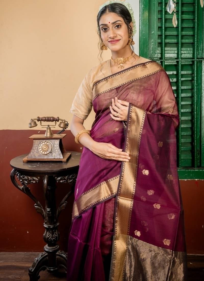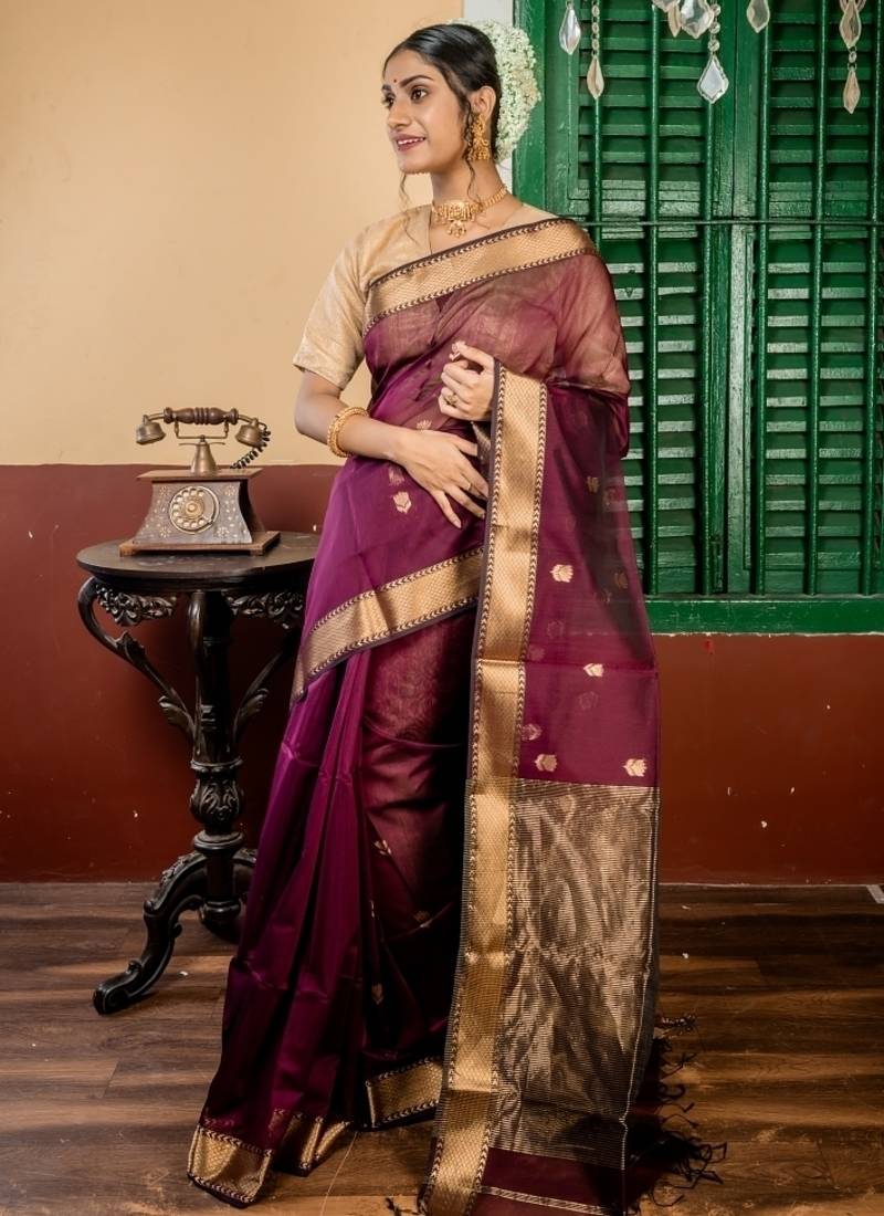 Wine hand woven silk blend cotton zari work all seasons sarees