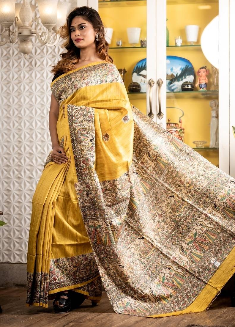| Product Description | Mustard Yellow Ghicha Tussar Saree Is A Vibrant Celebration Of India’s Folk Art Traditions. The Saree Features A Plain Mustard Yellow Body That Highlights The Intricate Multi Colour ‘Madhubani’ Themed Border & Pallu. Every Element Echoes The Beauty Of Hand Drawn Storytelling.