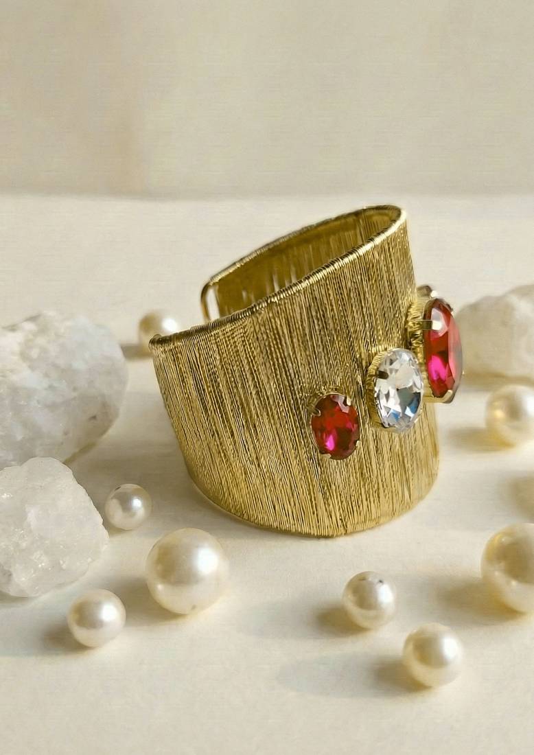 | Product Description | Gold Plated Mess Wire Cuff Bracelet Adorned With A Dazzling Big Red Korean Cz Shiny Glass Crystal Stone.Its A Lightweight, Adjustable, And Perfect For Elevating Both Casual And Festive Looks. A Timeless Statement Piece For Every Jewelry Lover. |