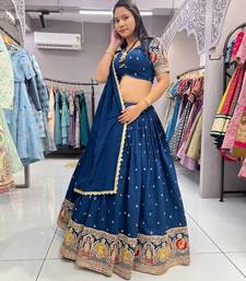 Blue sequins and thread embroidered roman-silk indian designer lehenga choli