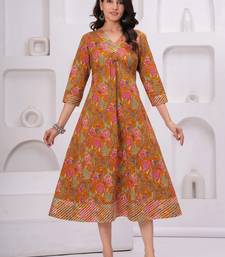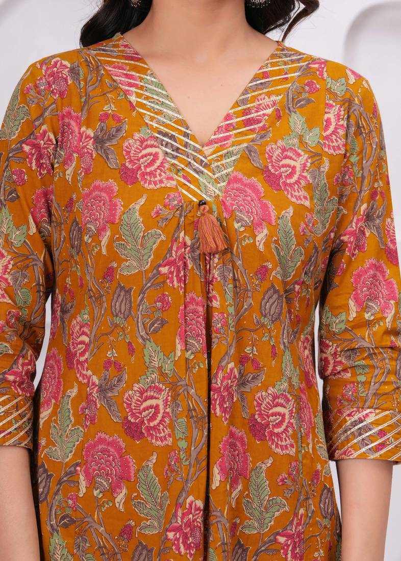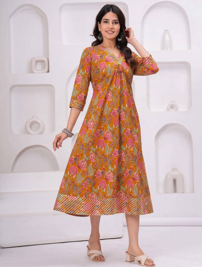 | Product Description | Mona Prints Floral Printed Musterd Pure Cotton Fit & Flare Ethnic Dress |