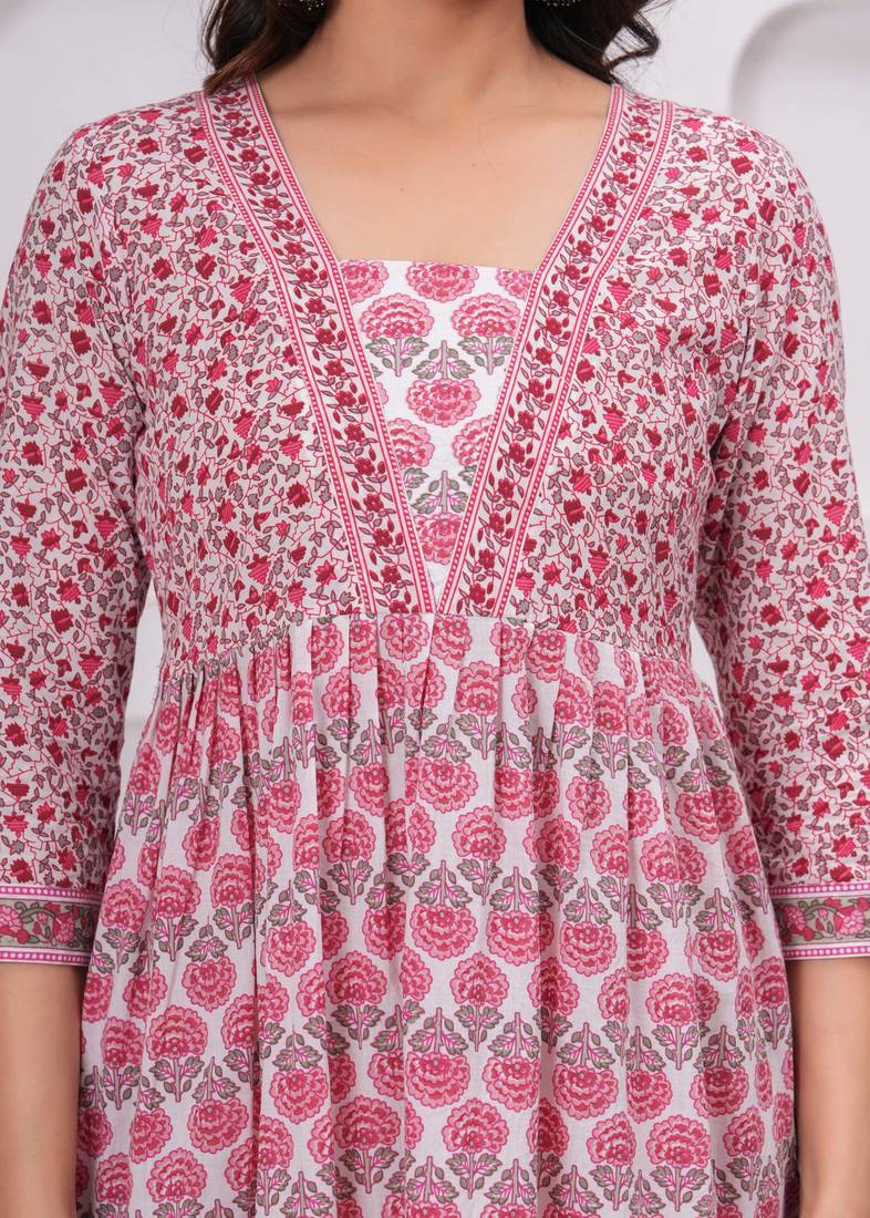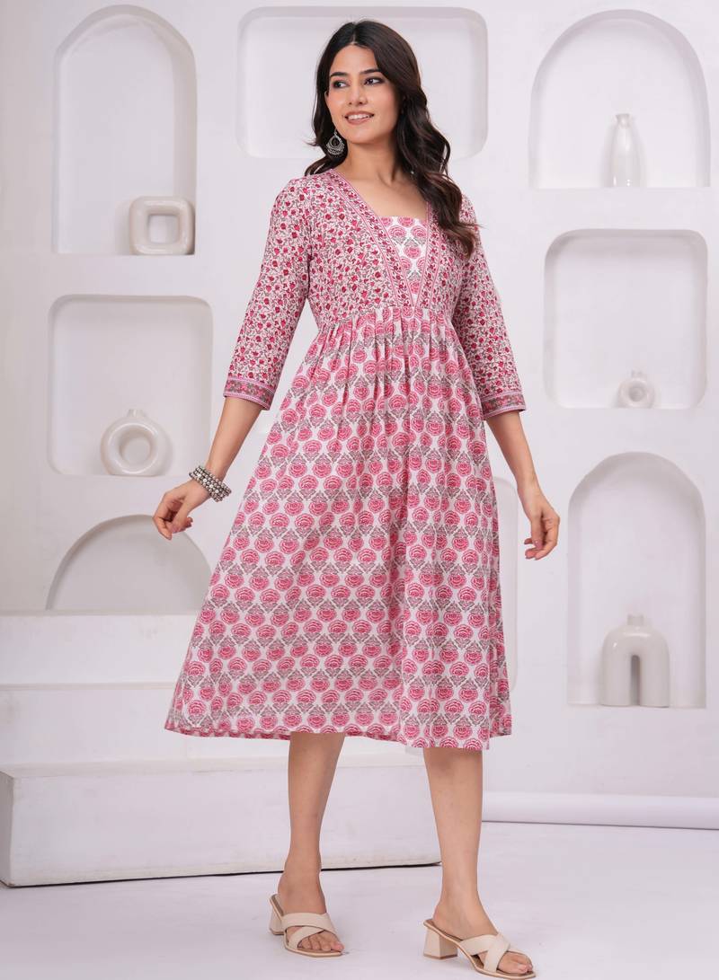 | Product Description | Mona Prints Printed White & Pink Pure Cotton Regular Ethnic Dress |