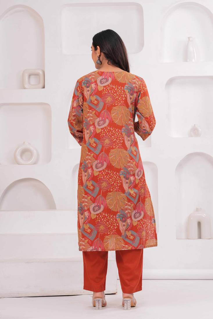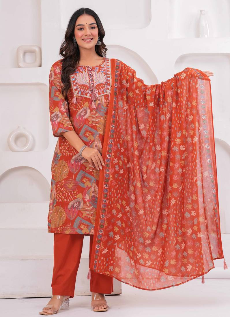| Product Name | Rust Women Embroiderd Printed Cotton Kurta With Trousers & With Dupatta | |