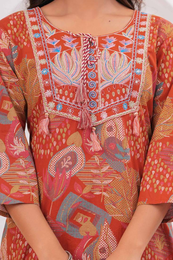 | Product Description | Mona Prints Rust Women Embroiderd Printed Pure Cotton Kurta With Trousers & With Dupatta |