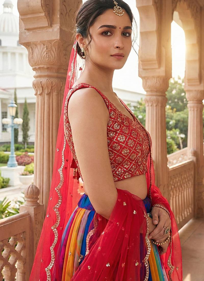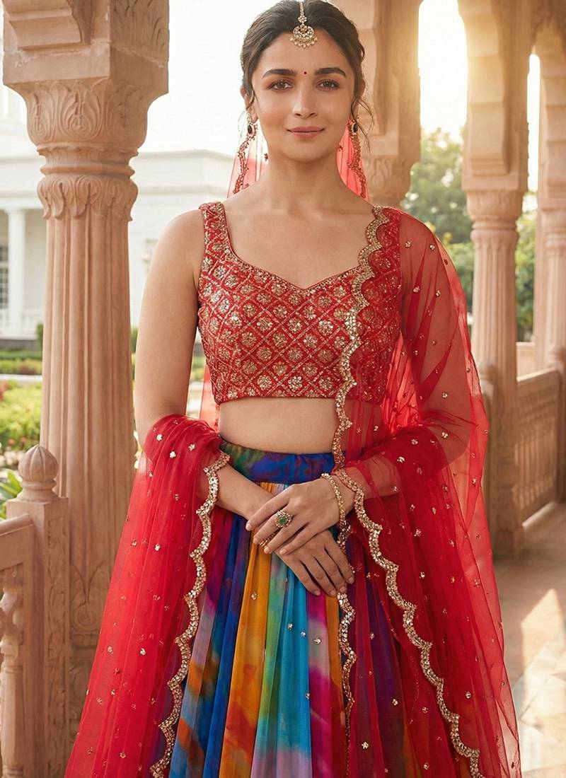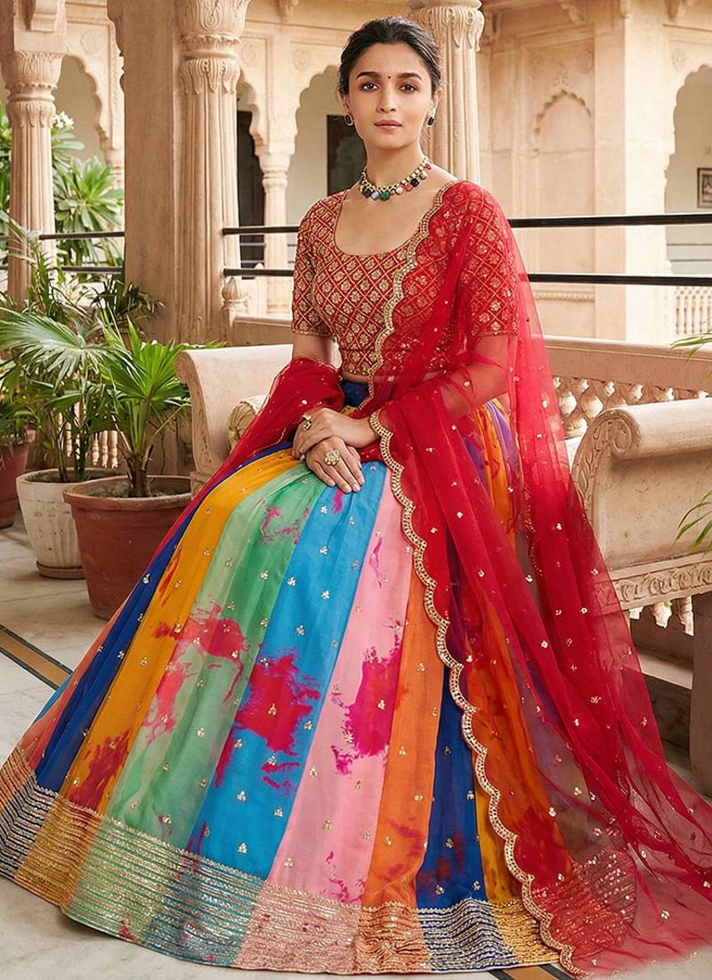 | Product Description | Be The Sunshine Of Everybody’s Eyes Dressed With This Pretty Alia Bhatt Multi Colour Georgette Lehenga Choli. The Ethnic Embroidered And Print Work To Your Dress Adds A Sign Of Attractiveness Statement For The Look. Comes With Matching Choli And Dupatta. Note: Dupatta Size Comes In 2 Mtr. (Slight Variation In Color, Fabric & Work Is Possible. Model Images Are Only Representative.) |