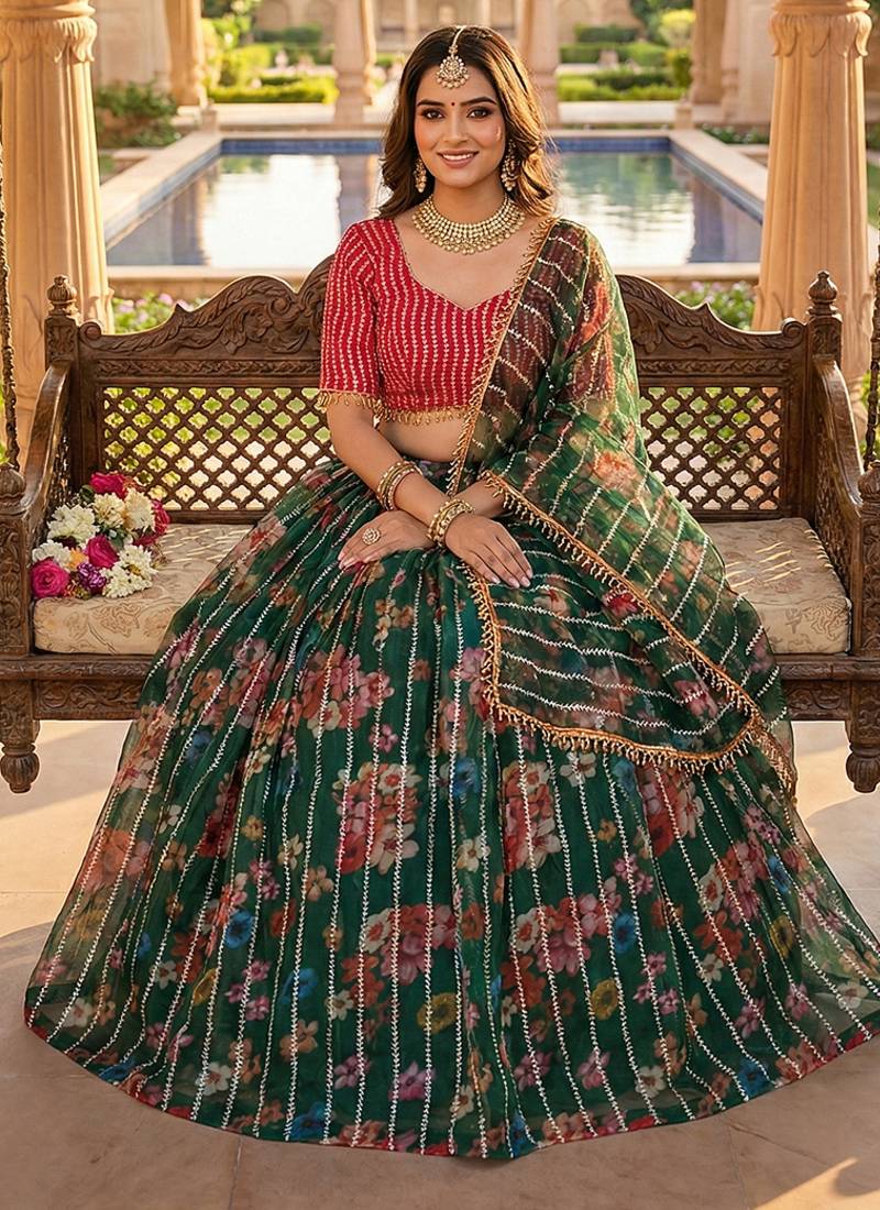 Dark green floral printed embroidered organza lehenga set choli dupatta