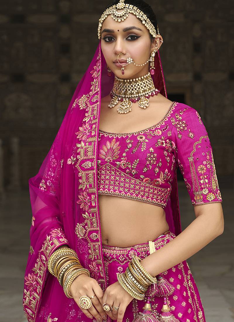 Magenta pink embroidered silk blend bridal lehenga set choli dupatta