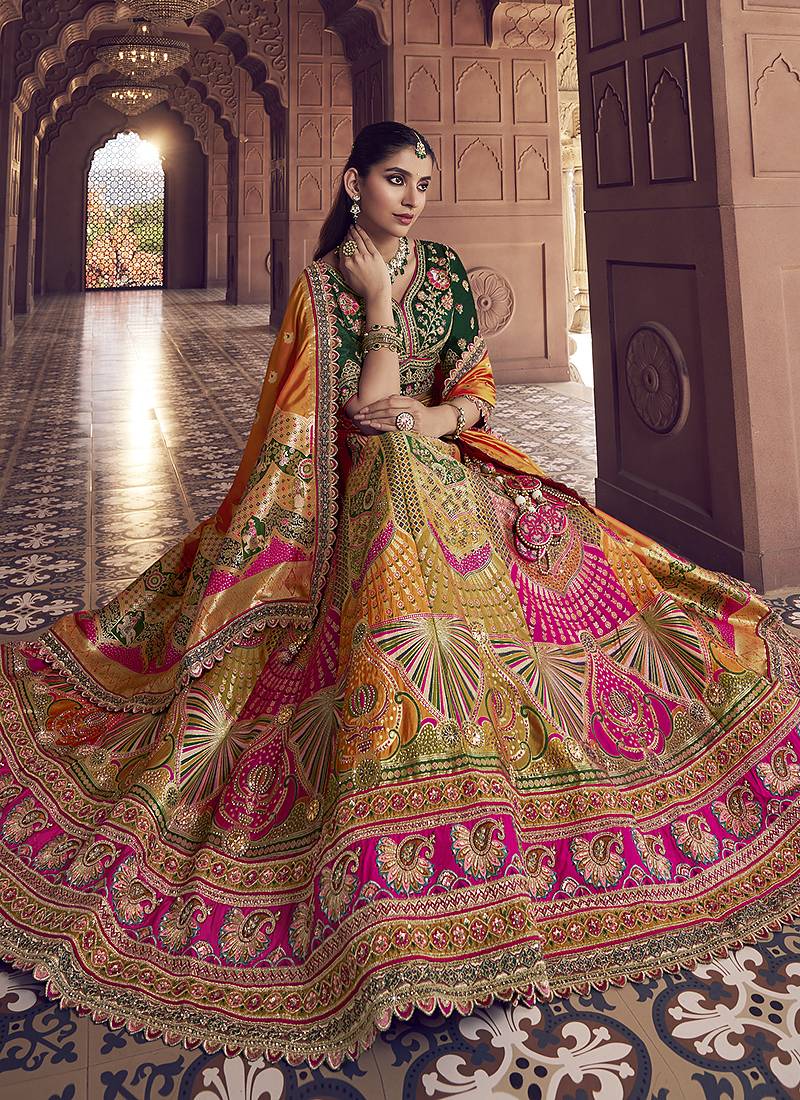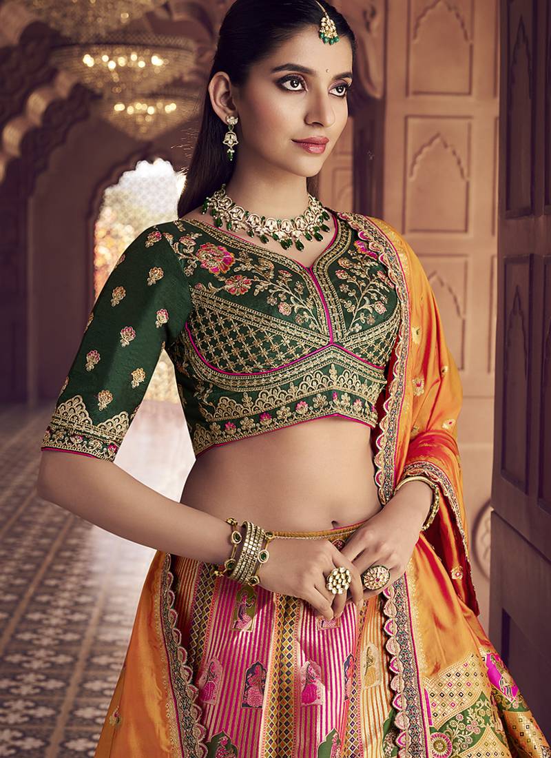 | Product Description | Give In To The Exotic Confluence Of Today And Tomorrow In This Beautiful Attire. Style And Trend Will Be At The Peak Of Your Beauty When You Attire This Multi Colour Banarasi Silk Blend Designer Lehenga Choli. Beautified With Embroidered, Sequins, Swarovski And Weaving Work All Synchronized Well With The Pattern And Design Of The Attire. Comes With Unstiched Choli And Dupatta. Note: Dupatta Size Comes In 2 Mtr. (Slight Variation In Color, Fabric & Work Is Possible. Model Images Are Only Representative.) |