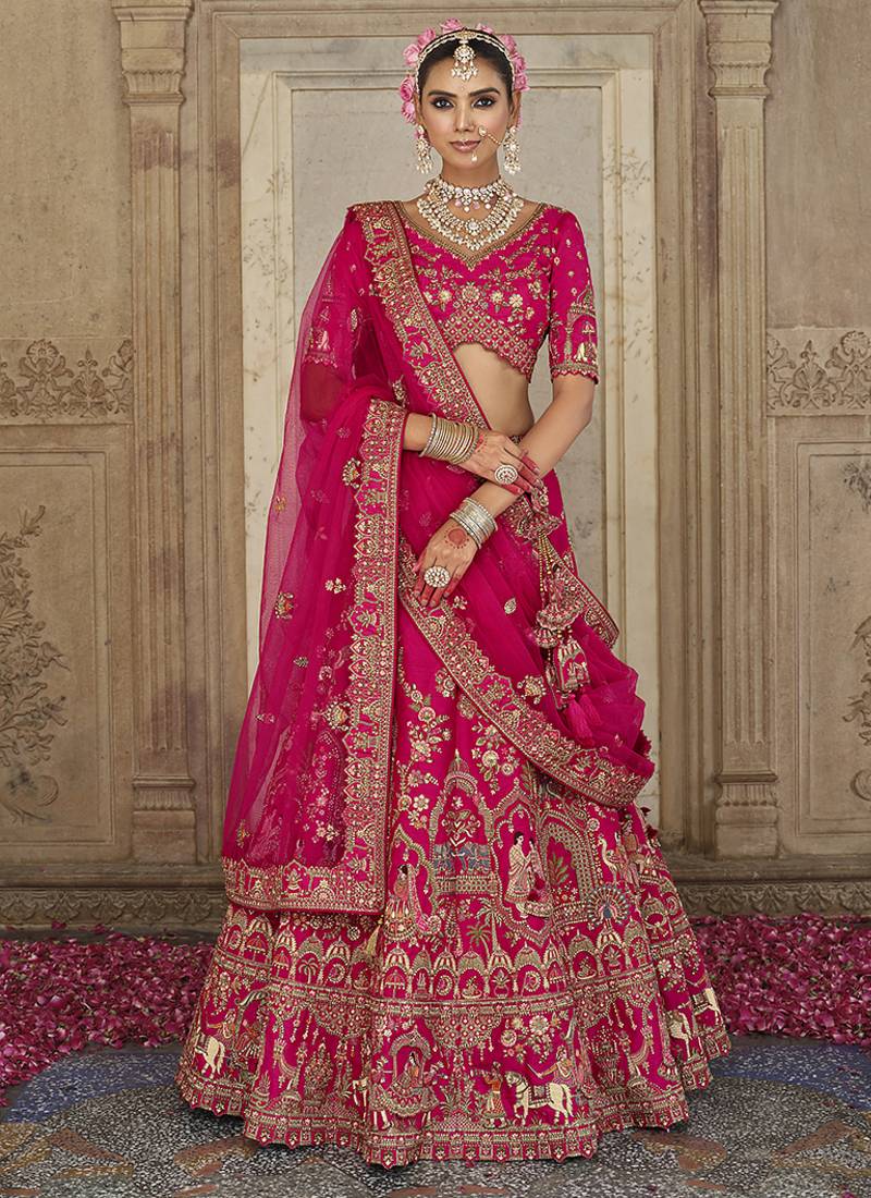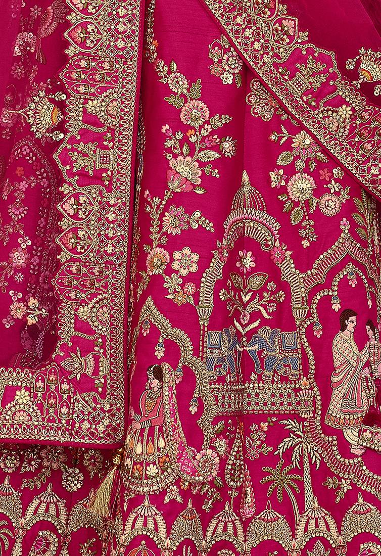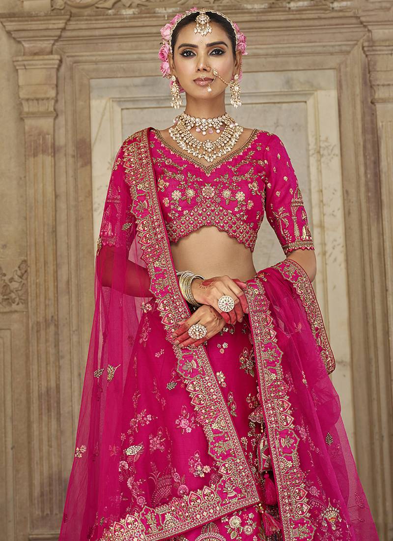 Rani pink embroidered silk blend bridal lehenga set choli dupatta