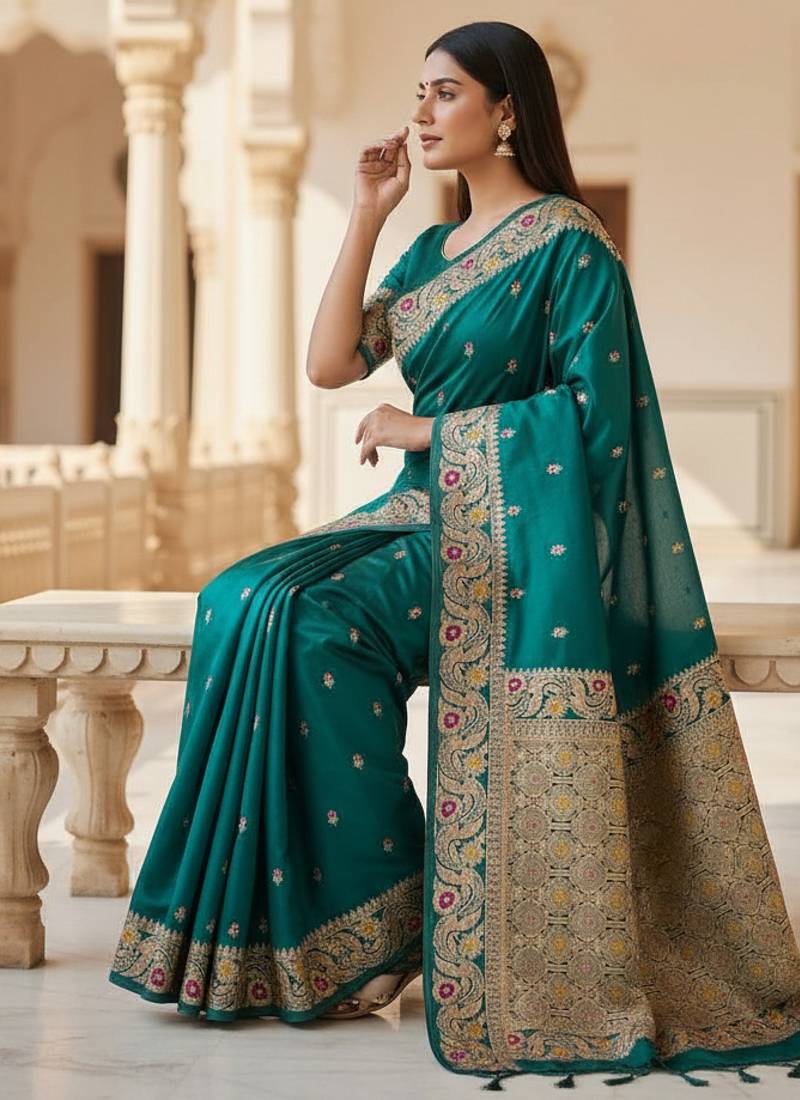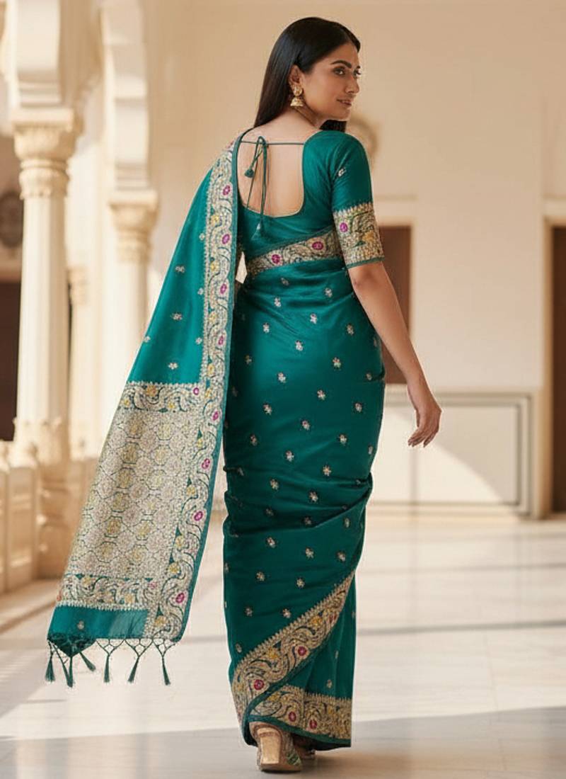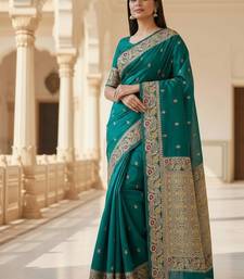 Teal color meenakari zari weaving soft art silk saree with unstiched blouse