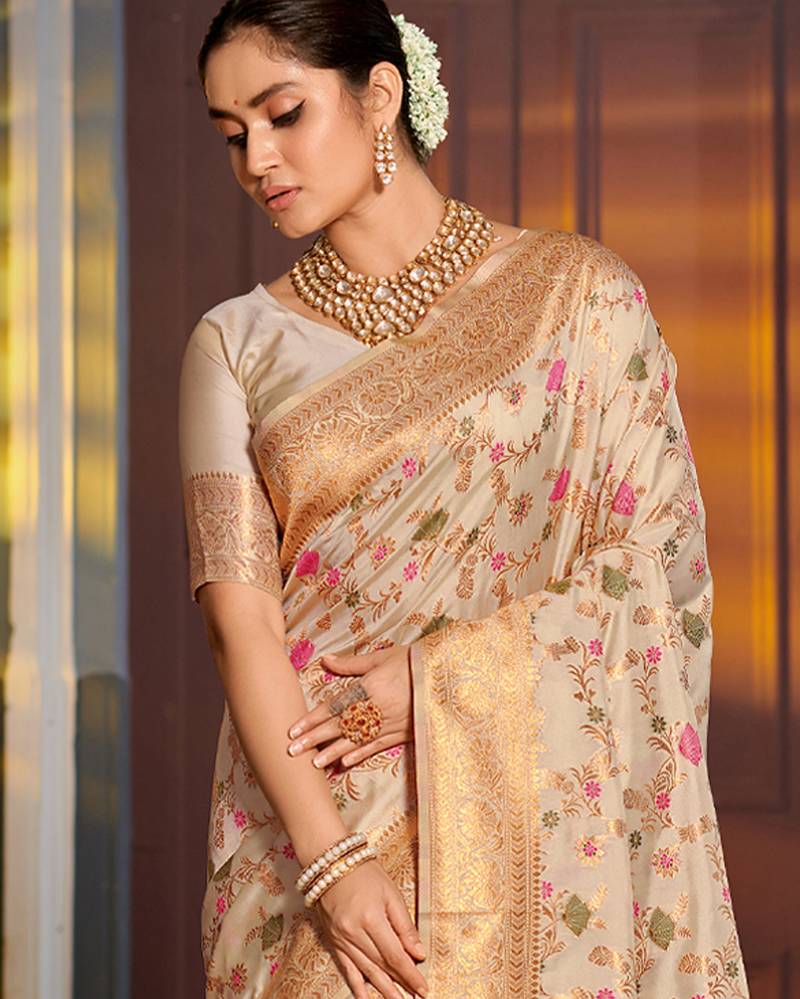 | Product Name | Cream Color Woven Work Banarasi Art Silk Saree | |