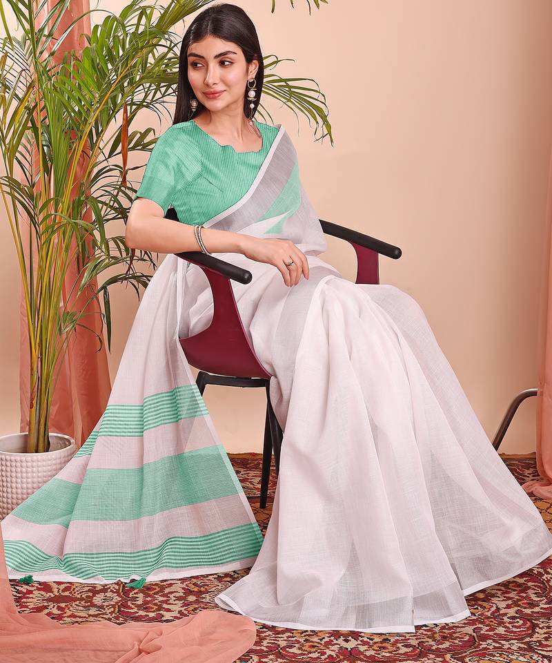 White color linen cotton zari border saree