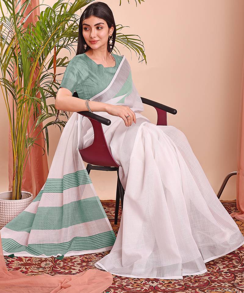 White color linen cotton zari border saree