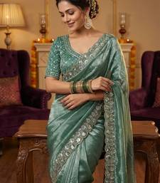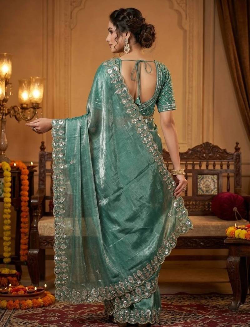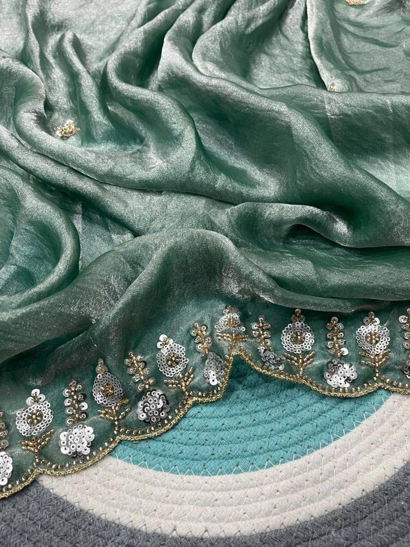 Blue color embroidery work of beads & sequins work fendy satin silk saree