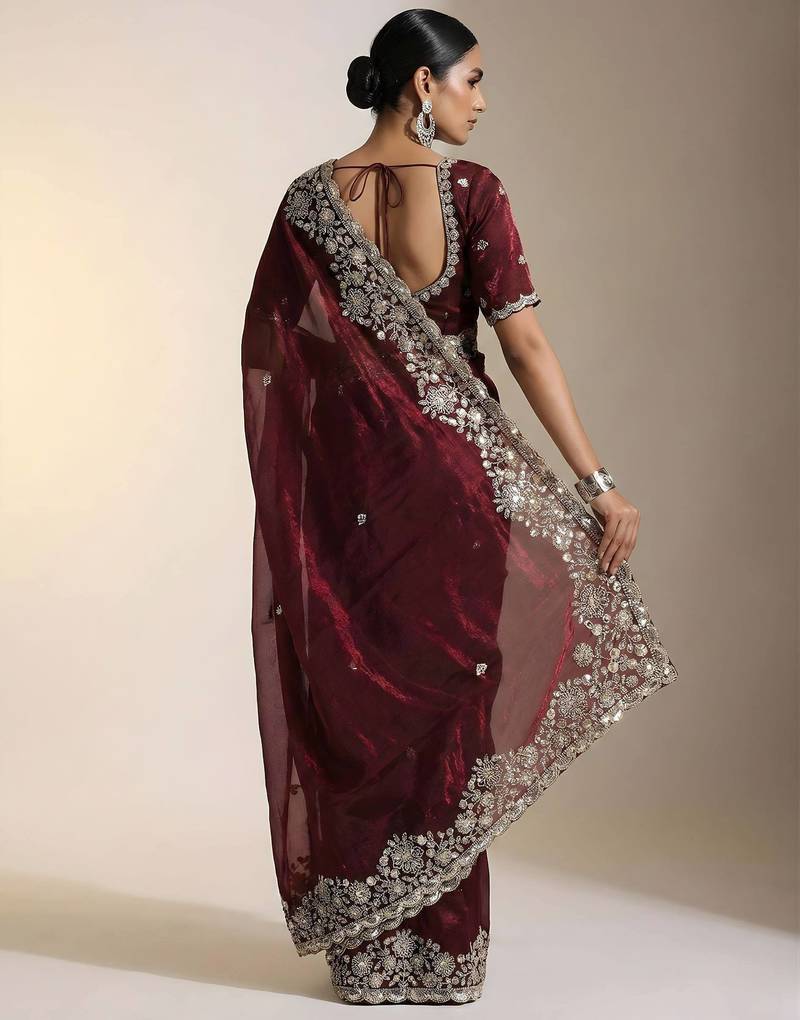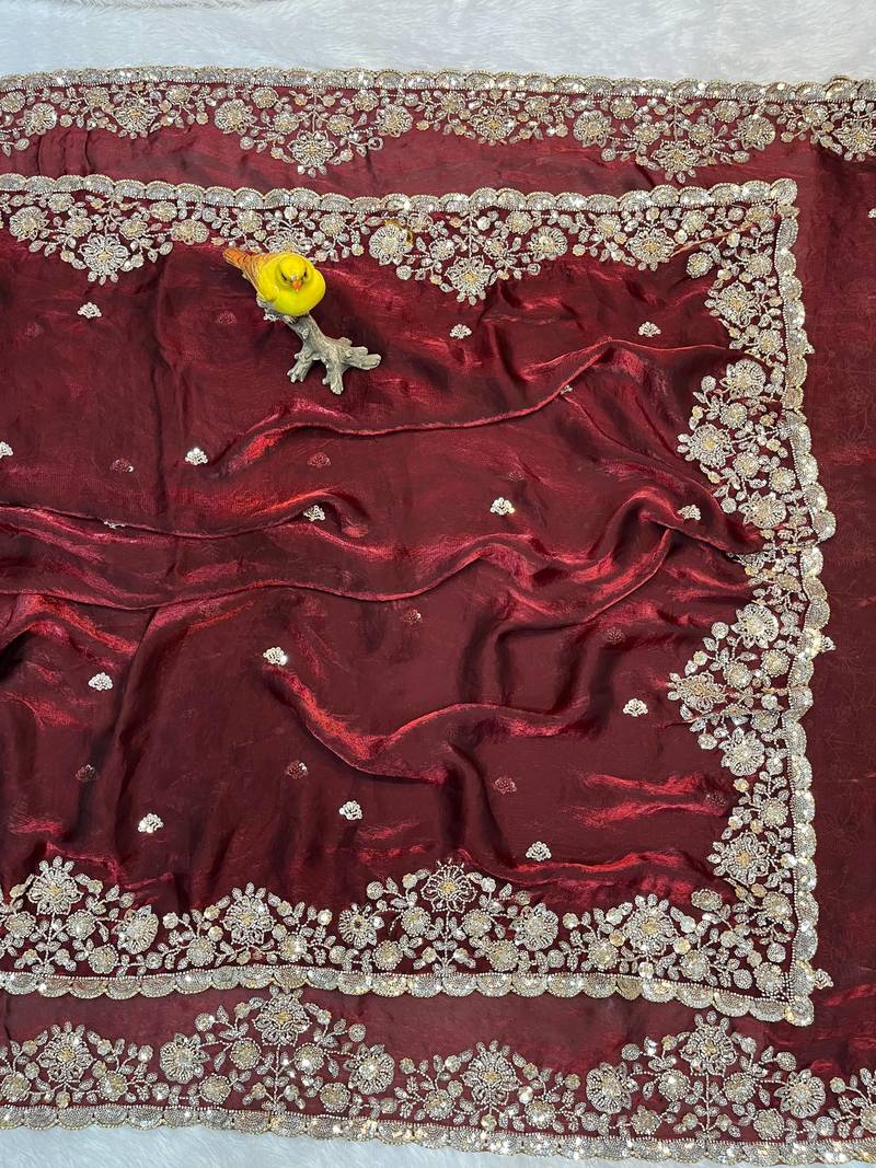 Maroon color embroidery work of beads & sequins work fendy satin silk blend saree