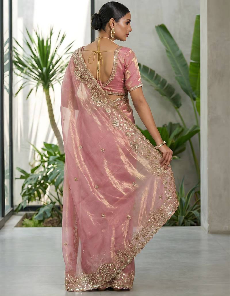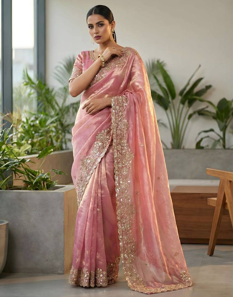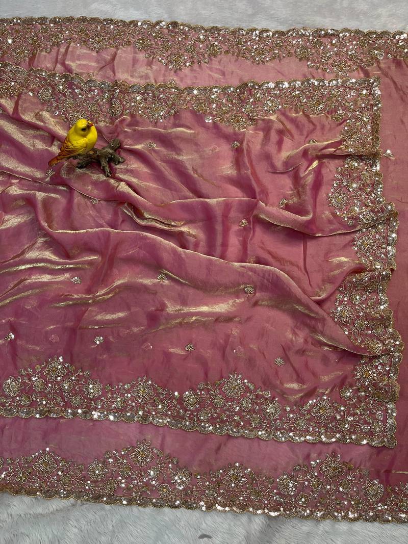 Pink color embroidery work of beads & sequins work fendy satin silk blend saree