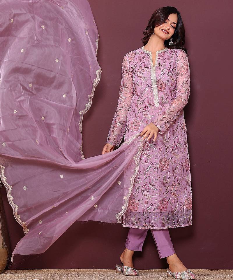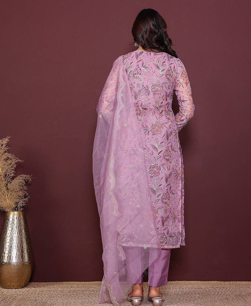 Pink embroidered thread work kurta with trousers & dupatta stitched
