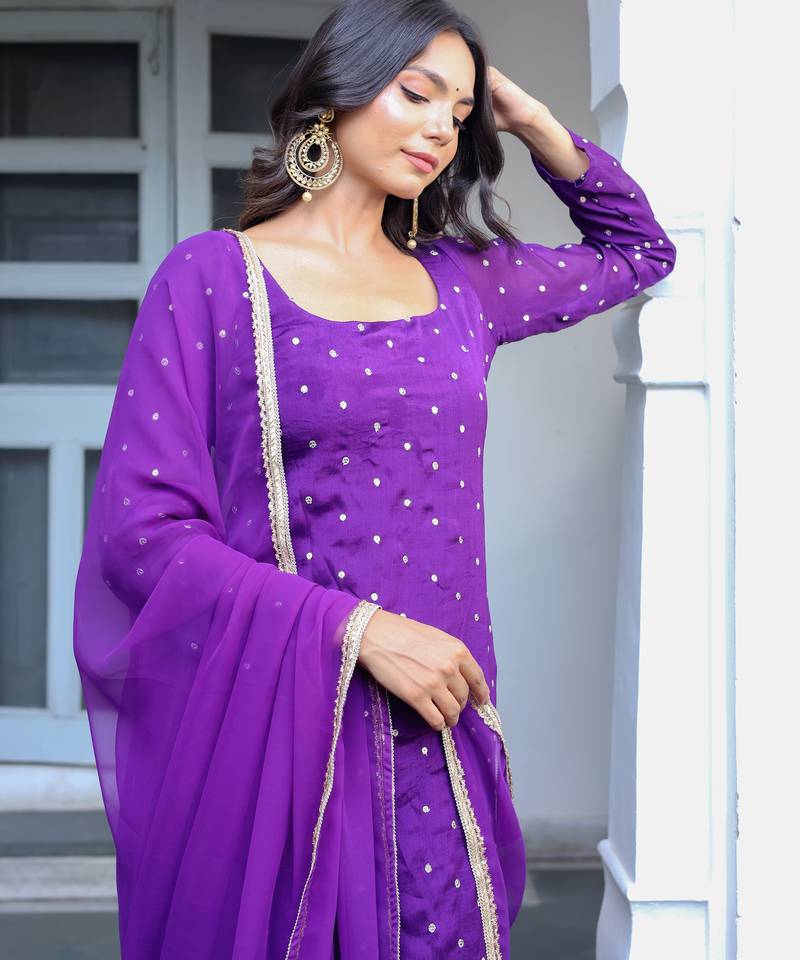 | • | Dupatta | : | Color- Purple / Fabric- Georgette |