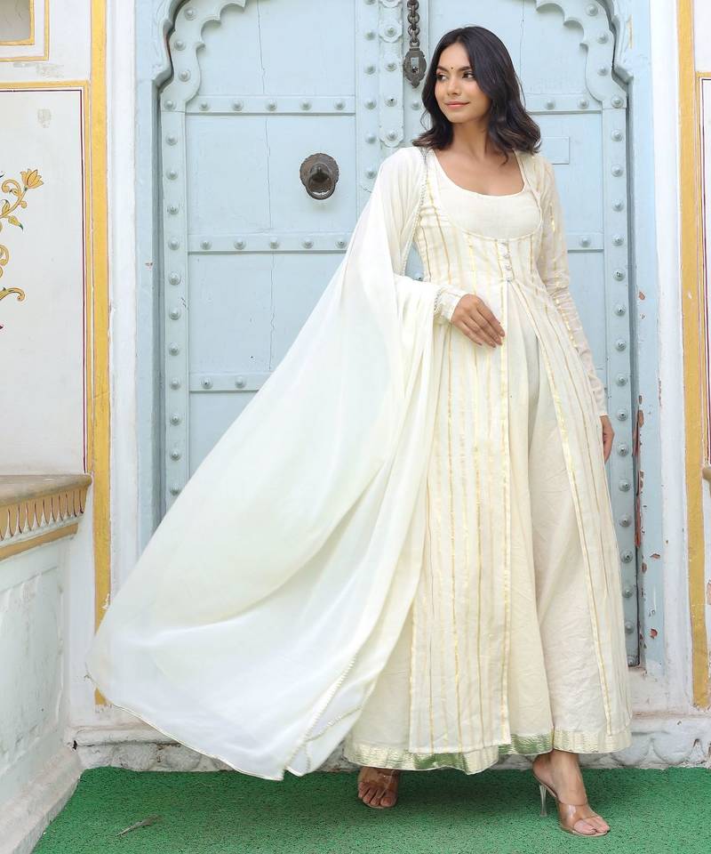 | Product Name | Off White Striped Solid Cotton Anarkali Kurta With Trousers & Dupatta | |