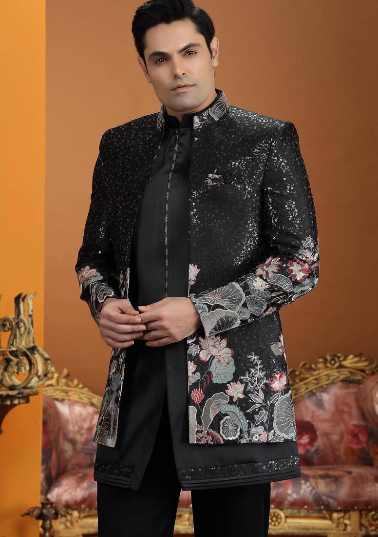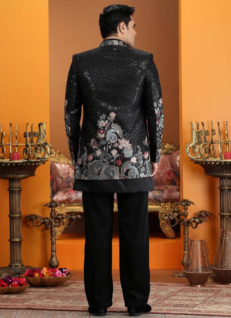 | Product Name | Black Computer Thread Work On Art Silk 3 Peice Indo Western Set For Men | |