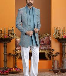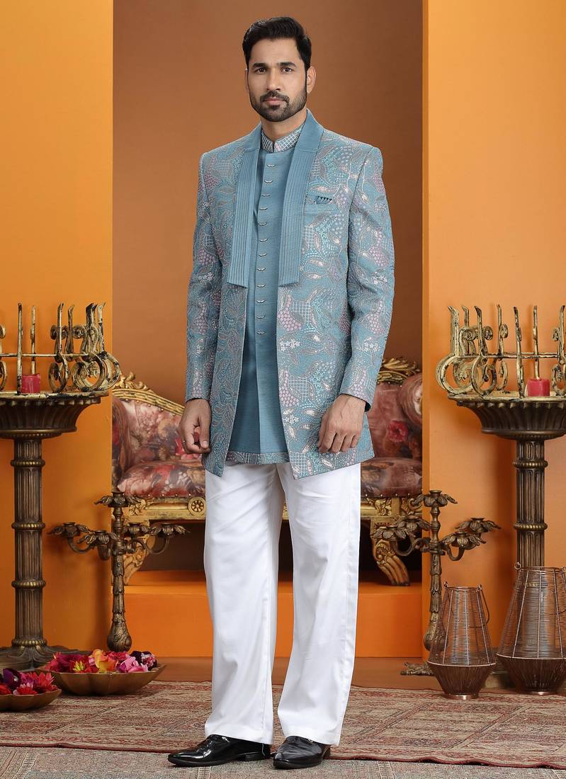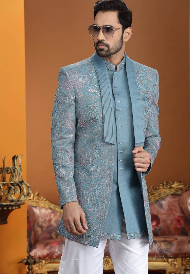 | Product Name | Blue Computer Thread Work On Art Silk 3 Peice Indo Western Set For Men | |