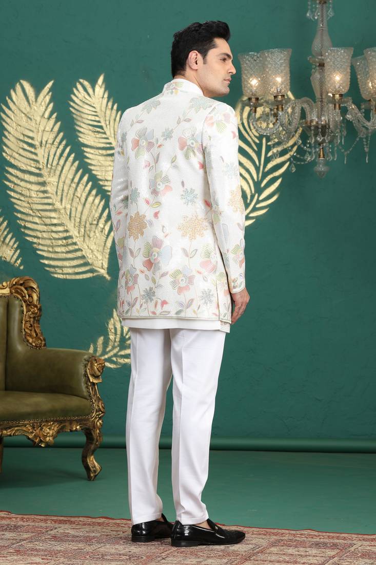 | Product Name | Cream Computer Thread Work On Art Silk 3 Peice Indo Western Set For Men | |