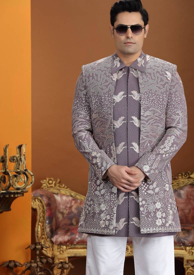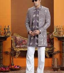 | Product Name | Purple Computer Thread Work On Art Silk 3 Peice Indo Western Set For Men | |