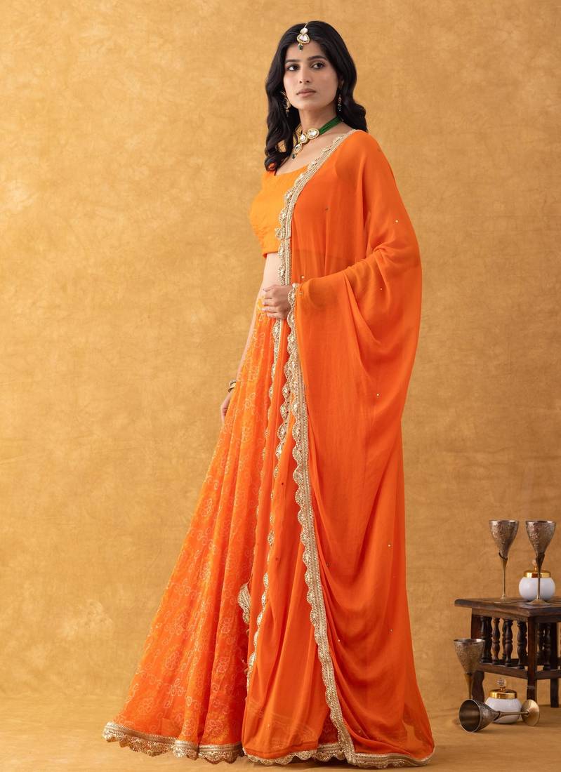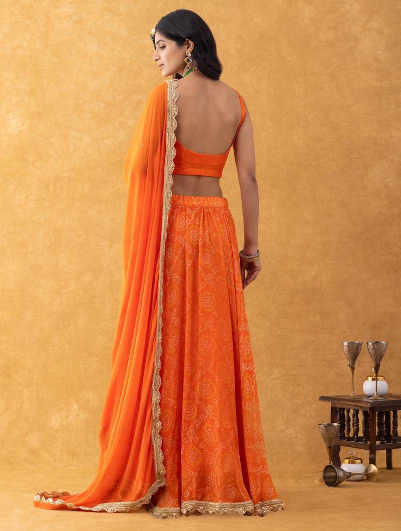 Orange bandhani lehenga set with choli and embellished dupatta