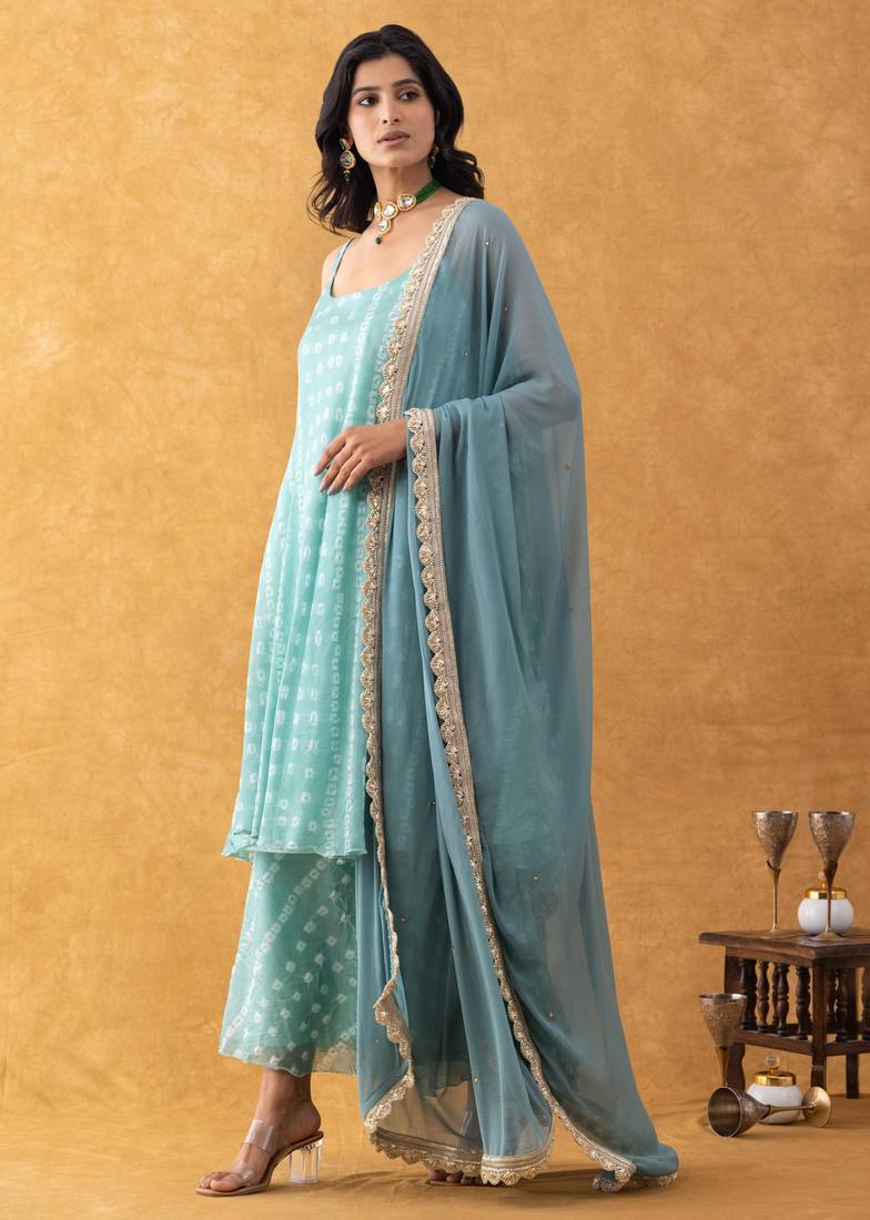 | Product Description | Key Highlights: Premium Silk Fabric With Natural Sheen And Smooth Drape Traditional Bandhani Inspired Print Throughout Flared Silhouette For An Elegant, Contemporary Appeal Coordinated Pants With All Over Print Detailing Matching Dupatta With Delicate Gold Border Finish Style It With Statement Jewellery And Neutral Heels For A Poised Festive Look That Reflects Timeless Indian Artistry With Modern Ease. |