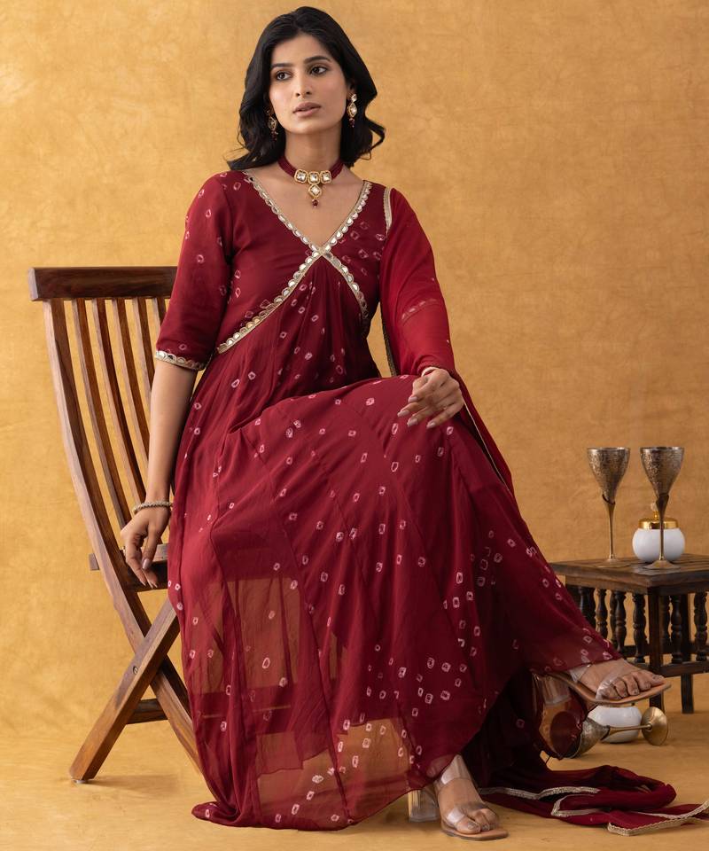 Wine bandhani suit set with dupatta stitched