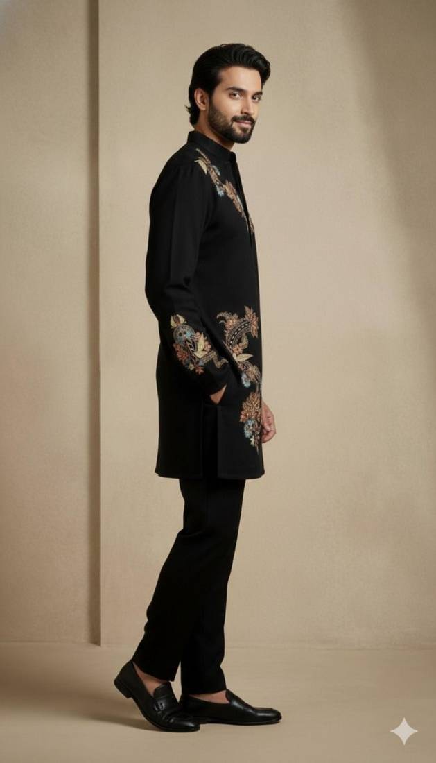 | Product Description | A Classic Black Kurta Set Featuring Intricate Multicolour Embroidery On The Chest, Sleeves, And Hem. Designed With A Mandarin Collar And Paired With Tailored Trousers, It’s Perfect For Festive Occasions |