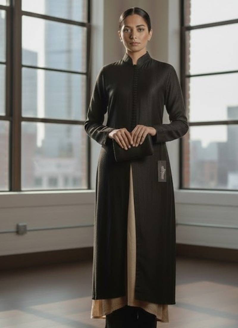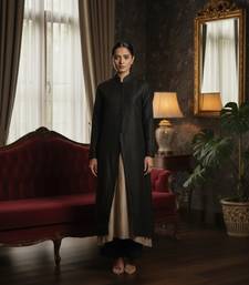 | Product Description | A Sophisticated Three Piece Ensemble Featuring A Long, Structured Black Jacket With A Mandarin Collar, Layered Over A Contrasting Beige A Line Top. Crafted From Smooth Vichitra Silk, This Outfit Is Paired With Matching Black Straight Pants For A Sleek, Modern Layered Look. Top Length: 50 Inches Bottom Length: 38 Inches Dupatta: 2.5 Meters |