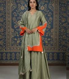 | Product Name | Olive Green Vichitra Silk Kurta Set With Contrast Orange Panels | |