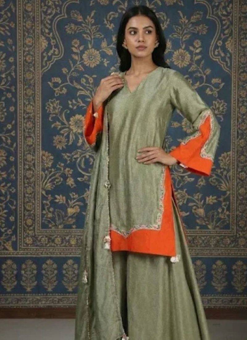 | Product Description | This Elegant Kurta Set Features A Rich Olive Green Vichitra Silk Kurta Paired With Matching Wide Leg Palazzo Pants. The Kurta Is Highlighted With Vibrant Contrast Orange Panels And Delicate Embroidered Detailing Along The Hem And Sleeves, Adding A Refined Ethnic Touch. A Soft, Flowy Dupatta With Subtle Border Accents Completes The Look. Perfect For Festive Gatherings, Daytime Celebrations, And Elegant Occasions, This Ensemble Blends Comfort With Timeless Indian Craftsmanship. |