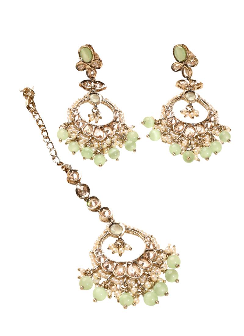 Leaf shape green pearl brown kundan gold plated brass chandelier earring maang tikka for women