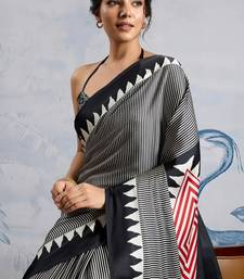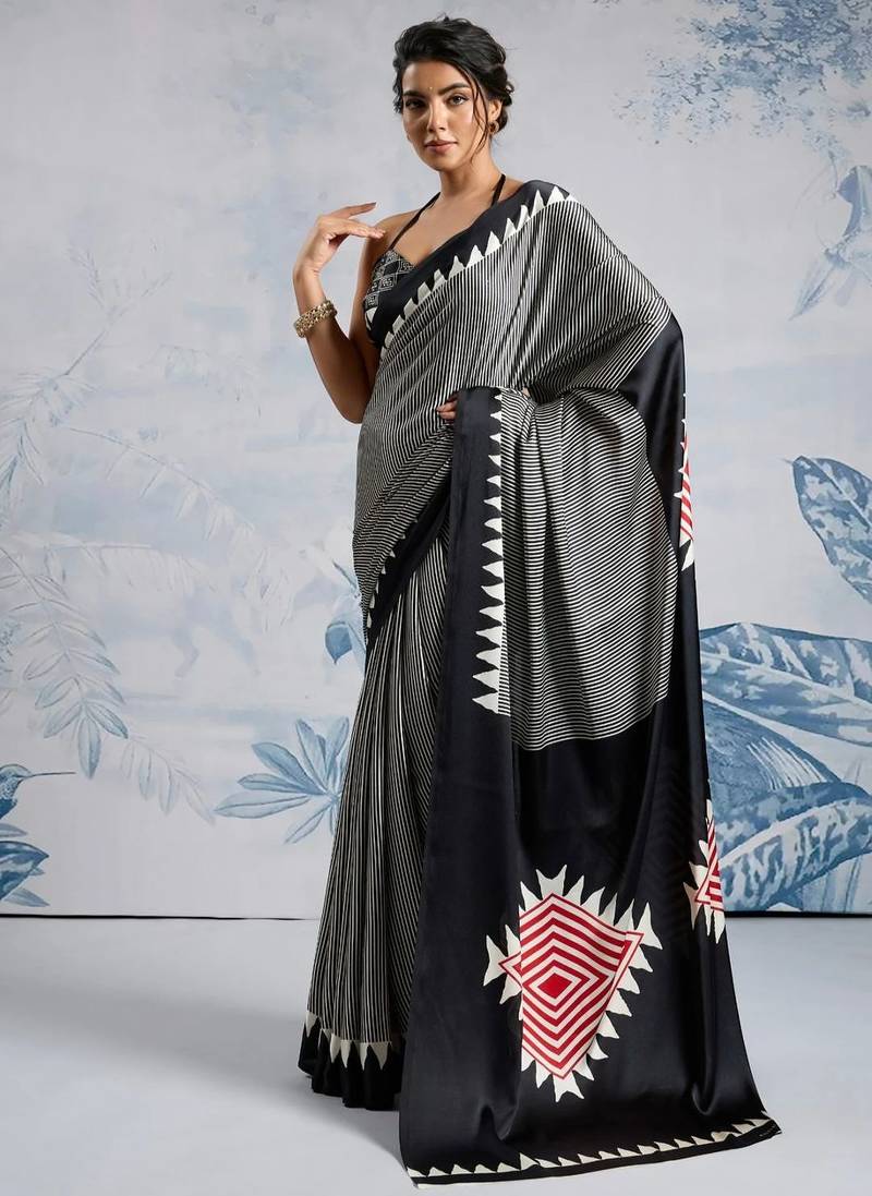 Black printed satin saree with blouse piece