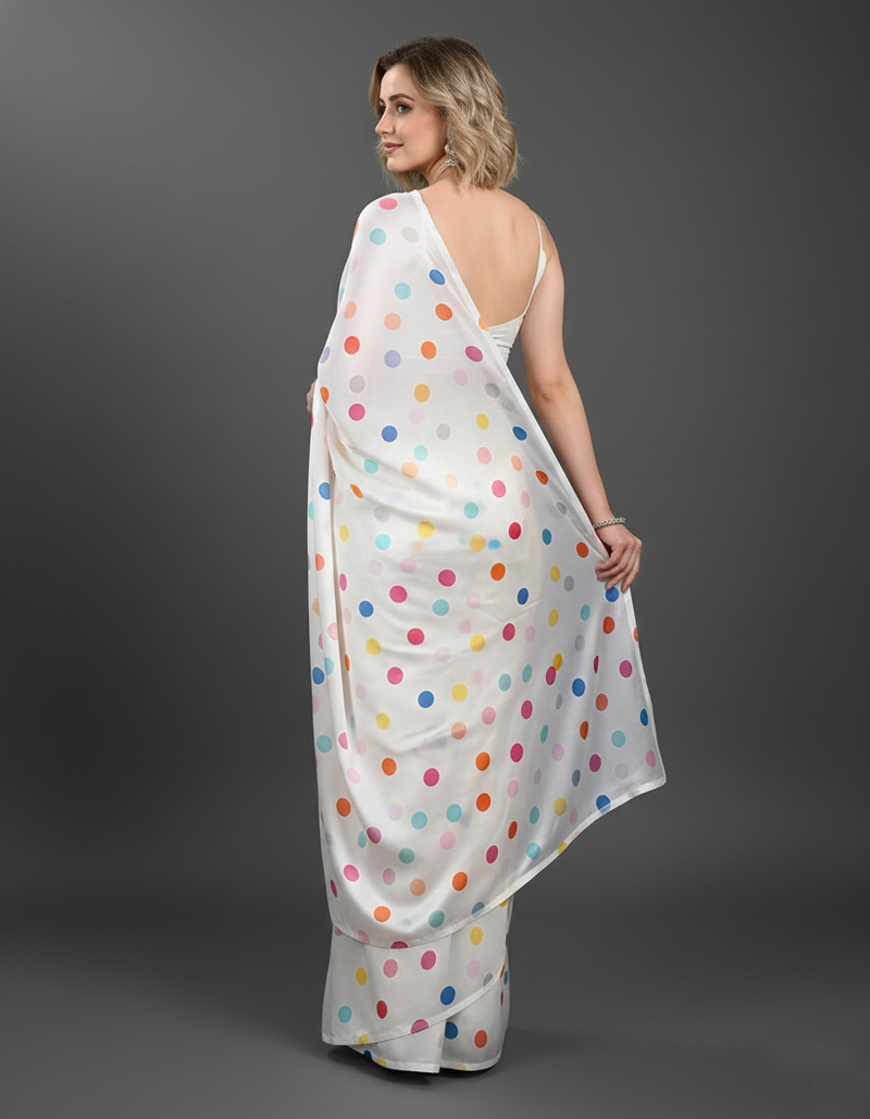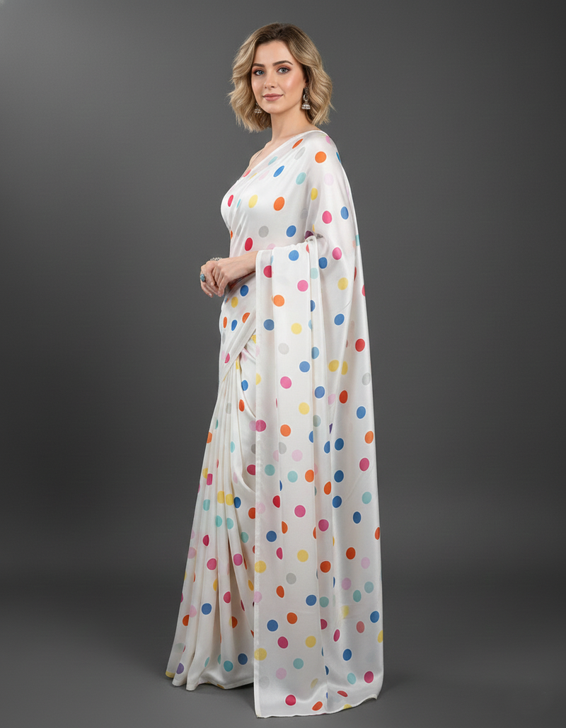 | Product Description | Soft Satin Saree Crafted With Multicolor Polka Dot Pattern All Over. Saree Comes With Unstitched Satin Blouse Piece. Note: Slight Variation In Color Is Possible Due To Photographic Flash Light Effect |