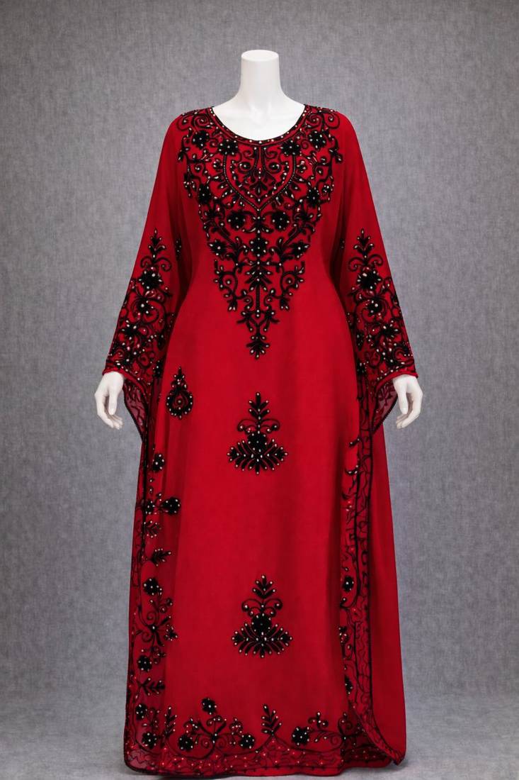 | Product Description | Fabric & Design This Black Velvet Kaftan Is All About Drama And Elegance. The Fabric Is Light And Flowy, Giving It That Effortless Drape, While The Surface Is Richly Embellished With Intricate Beadwork In Shimmering Gold Tones. The Embellishments Form Ornate Pattern Like Florals And Geometric Swirls, That Catch The Light Beautifully And Bring A Luxurious Texture To The Piece. With Its High Neckline And Long, Sweeping Silhouette, This Kaftan Makes A Bold Yet Graceful Statement For Any Special Occasion. Neckline & Sleeves The Neckline Is High And Regal, Edged With Detailed Beadwork That Adds To Its Richness. The Long Sleeves Follow The Same Story, Elegantly Cut And Finished With Embellished Cuffs To Mirror The Detailing On The Rest Of The Garment. It’s A Design That Feels Complete From Every Angle, Where Every Element Ties In Seamlessly. Styling Tips Let The Kaftan Take Center Stage It's Already Doing The Most In The Best Way. Keep Accessories Simple: A Pair Of Gold Statement Earrings Or A Bold Ring Is More Than Enough. An Updo Or Slicked Back Hair Will Show Off That Embellished Neckline, And A Gold Or Jewel Toned Clutch Adds Just The Right Pop Without Competing. Whether It’s A Festive Evening, Formal Dinner, Or Cultural Celebration, This Kaftan Guarantees You'll Turn Heads Without Even Trying Too Hard.