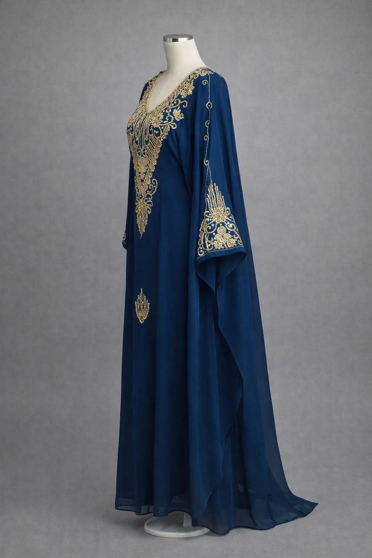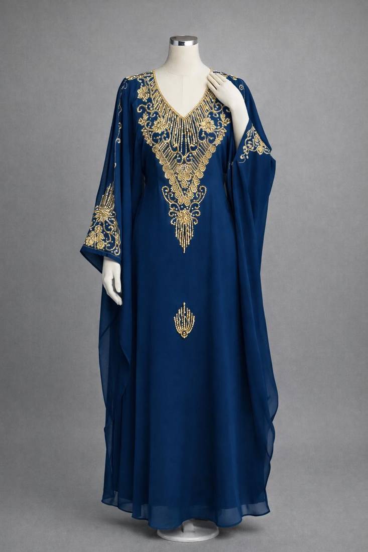 | Product Description | This Breathtaking Kaftan Gown Captures The Essence Of Luxury Event Wear, Ideal For Weddings, Receptions, And Gala Evenings. Made From Soft, Flowing Georgette, It Falls Beautifully To A Full Length Silhouette And Features A Flattering V Neckline That Adds A Touch Of Modern Grace. Every Inch Of The Gown Is Richly Detailed With Intricate Gold And Silver Toned Hand Embroidery, Highlighted By Delicate Sparkling Embellishments Arranged In A Traditional Pattern. The Flowing Split Batwing Style Cape Sleeves Drape Elegantly To The Floor, Creating A Sense Of Movement And Regal Charm. Designed To Turn Heads, This Piece Is Perfect For Making A Lasting Impression At Any Grand Occasion. |