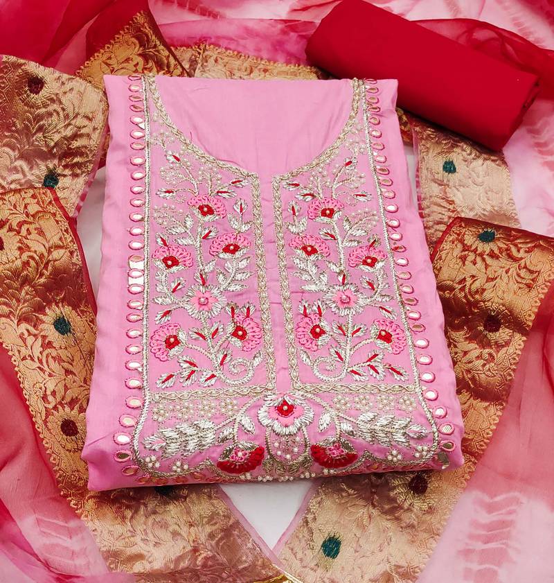 | Product Description | Fancy Multi Embroidery Moti Work And Border With Banarasi Dupatta Straight Style 1.90 Mtr Unstitched Dress Material Top Of Baby Pink Colour Cambric Cotton Fabric Also Including 2.10 Mtr Bottom Piece Material Of Red Colour Cotton Fabric With 2.00 Mtr Dupatta Of Multi Colour Soft Nazneen Banarasi Fabric |