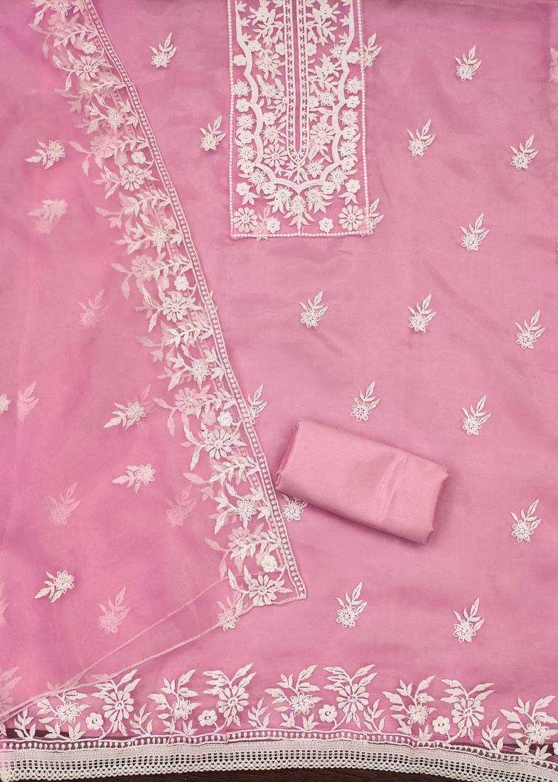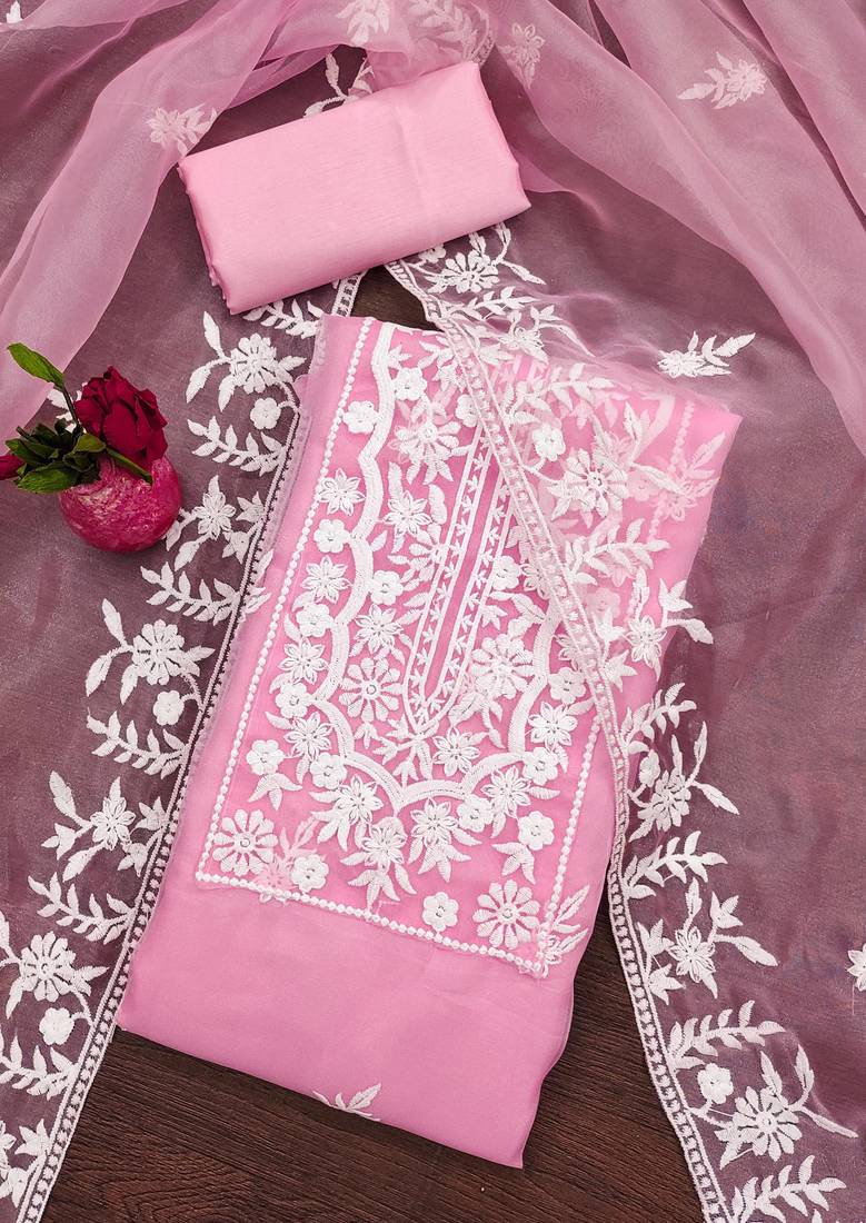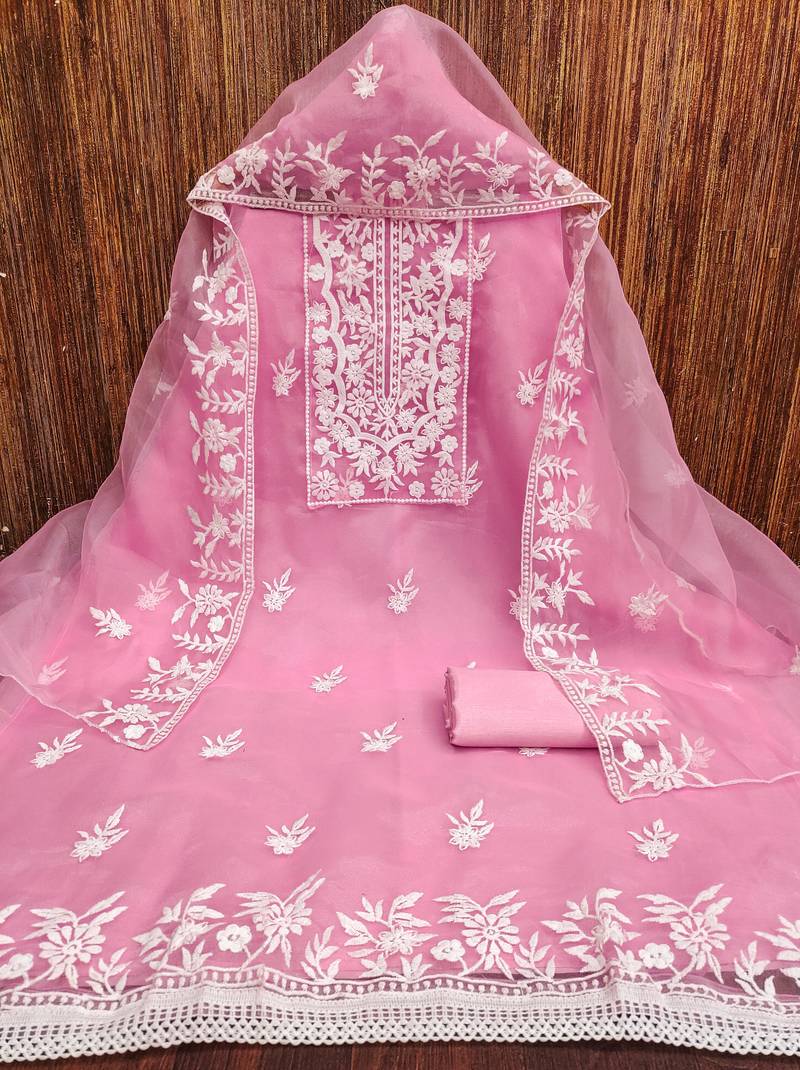 Baby pink organza embroidered dress material unstitched