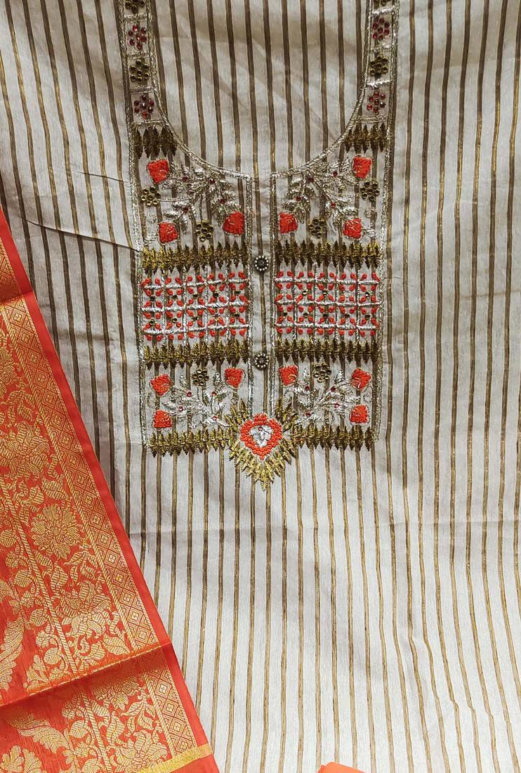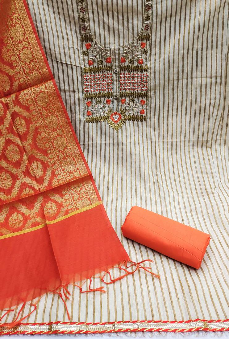 | Product Description | Beautifull Heavy Multi Zari Embroidery With Fancy Border And Weaving Dupatta Straight Style 1.80 Mtr Unstitched Dress Material Top Of Beige Colour Cambric Cotton Fabric Suggestable Quarter Style Sleeves And Round Style Neck Also Including 2.00 Mtr Chudidar Style Bottom Piece Material Of Orange Colour Cotton Fabric With 2.00 Mtr Dupatta Of Orange Colour Banarasi Jacquard Fabric |